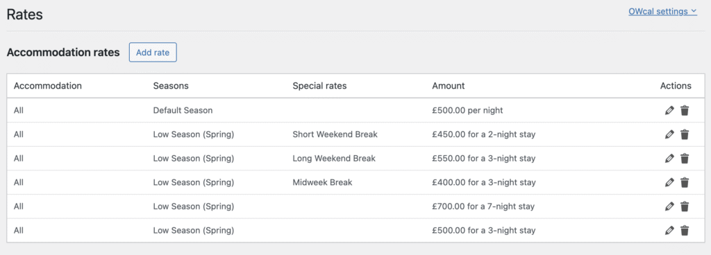 The example below has 5 different Rates for the Season ‘Low Season (Spring)’